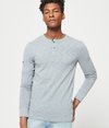 Superdry Bootlegger Grandad-herenshirt met lange mouwen. Dit casual shirt met lange mouwen heeft een kraag in Grandad-stijl, een sluiting met twee knopen, geribde manchetten en verstevigde patches op de ellebogen. Het Bootlegger Grandad-shirt met lange mouwen is afgewerkt met een Superdry-logolabel op de zijnaad en op één mouw.